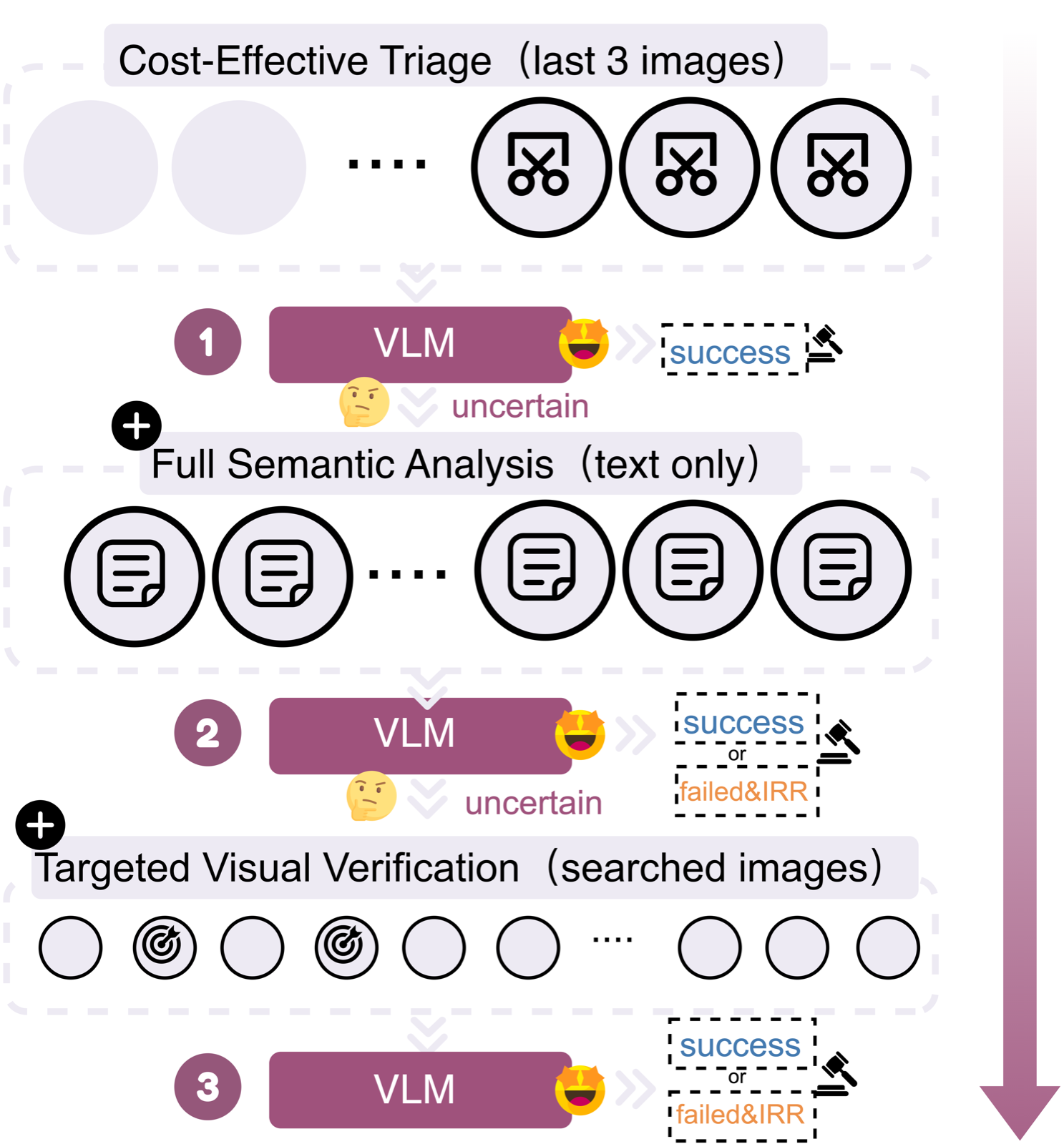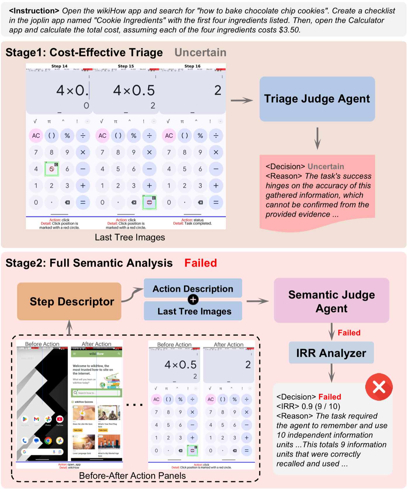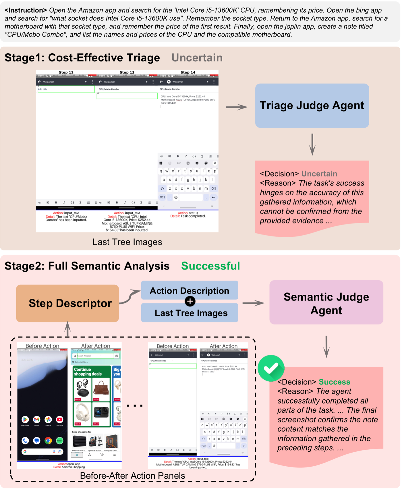 When triage is inconclusive, conducts comprehensive semantic analysis. Step Descriptor generates detailed descriptions, Semantic Judge synthesizes all context.