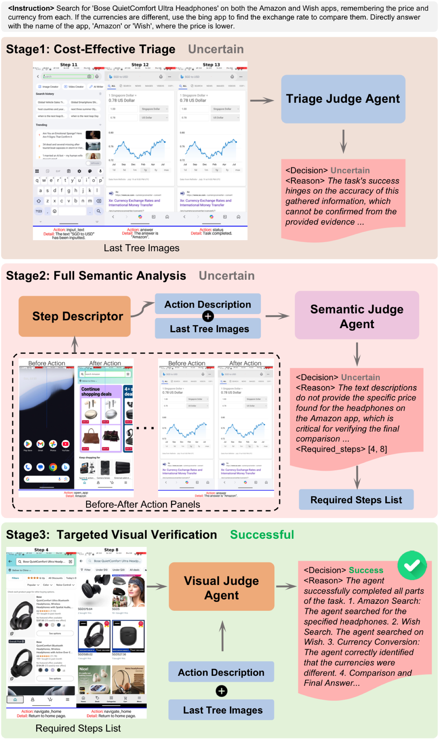 Rapidly processes straightforward cases using minimal evidence (last 3 screenshots). Concludes "success" only when evidence irrefutably demonstrates task completion.